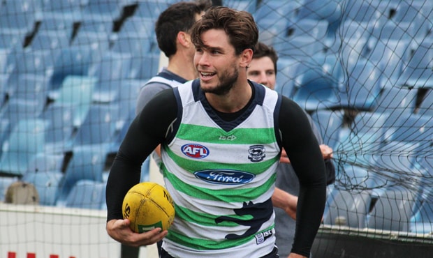 Tom Hawkins enjoys a laugh as the goalkicking session continues