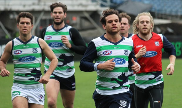 Steven Motlop leads the way in a running drill